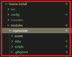 Once TSWoW has started, type the command module create mymodule --datascripts --assets --livescripts. This will create a new directory called mymodule in your modules folder.